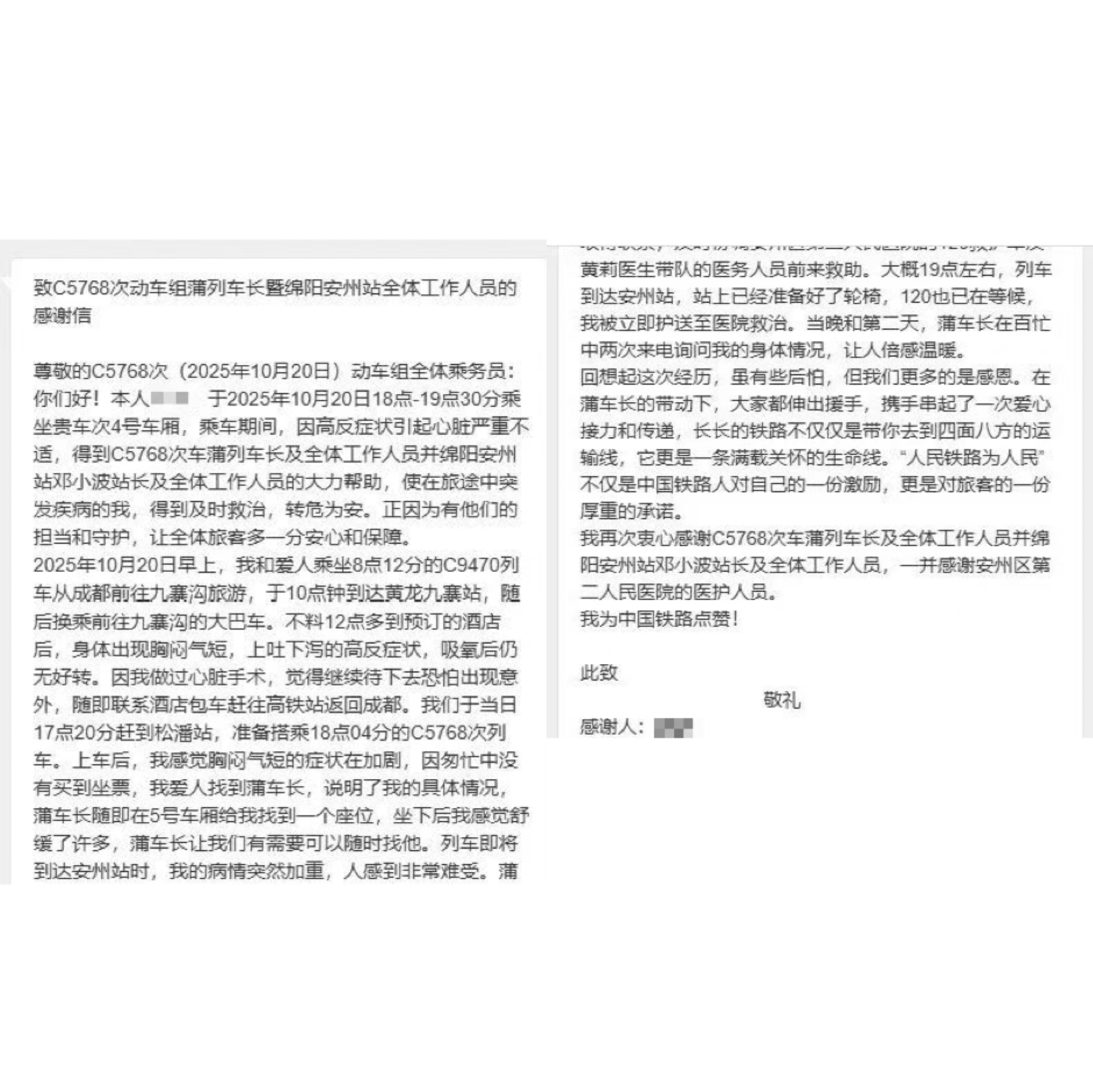 近日,旅客曾先生通过铁路12306平台写了一封感谢信,他要感谢的对象是川青铁路C5768次列车列车长蒲文纬与乘务班组,以及安州站站长邓小波与车站全体工作人员。因为就在几天前,他因为高反引发心脏不适,在铁路工作人员的帮助下才得到及时救治。